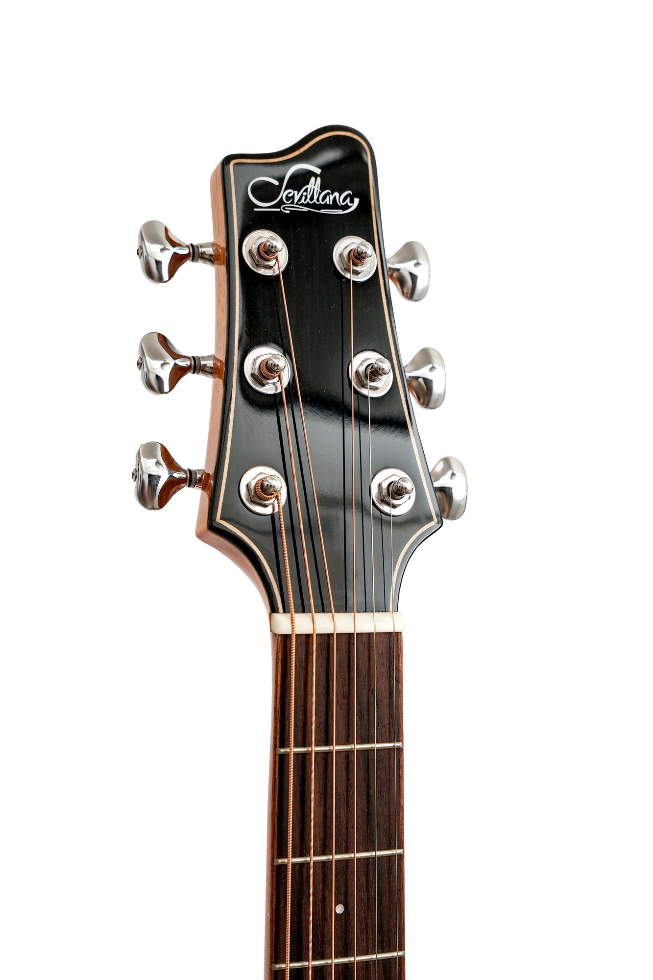 Sevillana Guitar provides you with the opportunity of a closer look at the solid spruce top guitar. Through all these pictures, you can enjoy their elegant lines and classic color.